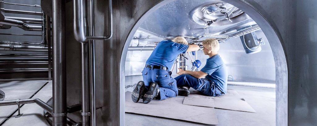 „Wir ersetzen zum Beispiel Gummidichtungen in regelmässigen Abständen“, sagt Silvano Knöpfel, Fachspezialist Mechanik. Ein Traumjob sei das, fügt der Polymechaniker Mattia Sigrist an. „Als Jugendlicher habe ich immer an Töfflis herumgeschraubt, hier bei Emmi schätze ich die Vielfalt der Aufgaben.“