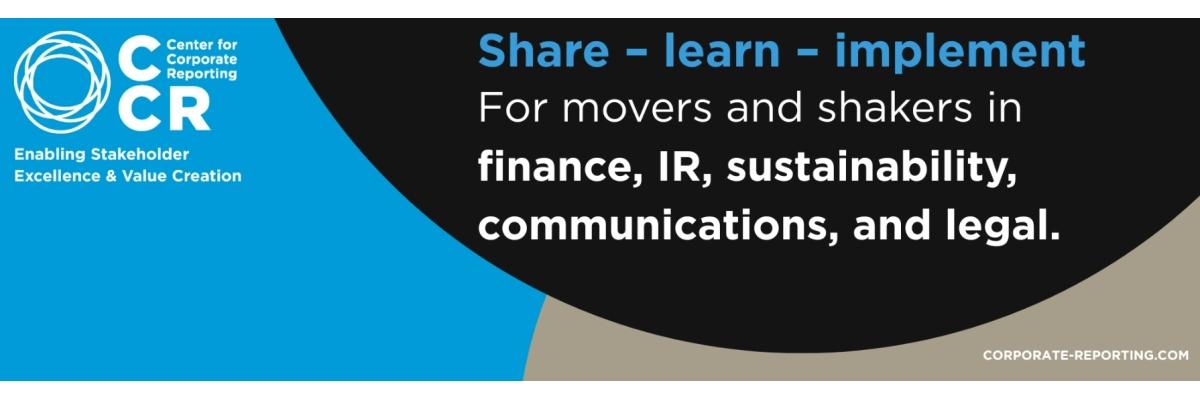 Das Center for Corporate Reporting (CCR) ist ein unabhängiges, mitgliederbasiertes Kompetenzzentrum für Unternehmensberichterstattung mit rund 100 Mitgliedern in der DACH-Region. Unter dem Motto «Share – Learn – Implement» bauen wir unser Serviceangebot für Firmenmitglieder kontinuierlich aus. Die Hauptansprechpartner bei unseren Firmenmitgliedern sind ExpertInnen aus den Bereichen Corporate Communications, Investor Relations, Sustainability, Finance und Legal.